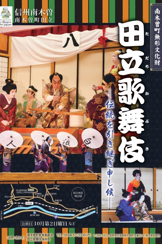 昭和48年(1973)4月18日に南木曽町無形文化財に指定され、田立歌舞伎保存会により現在も伝承されています。